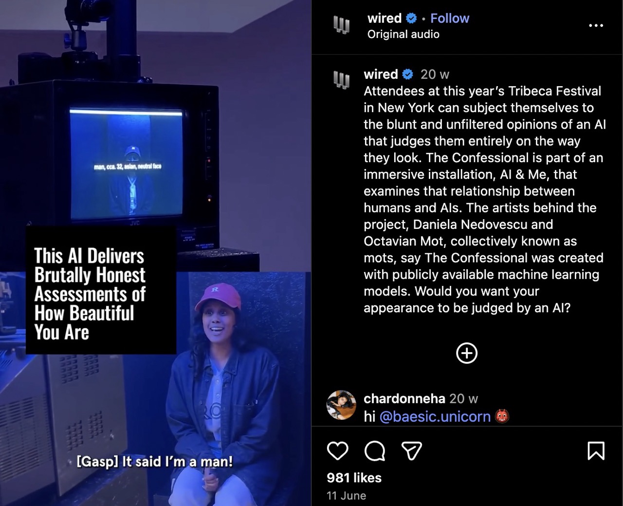 "Attendees at this year’s Tribeca Festival in New York can subject themselves to the blunt and unfiltered opinions of an AI that judges them entirely on the way they look. The Confessional is part of an immersive installation, AI & Me, that examines that relationship between humans and AIs. The artists behind the project, Daniela Nedovescu and Octavian Mot, collectively known as mots, say The Confessional was created with publicly available machine learning models. Would you want your appearance to be judged by an AI?"